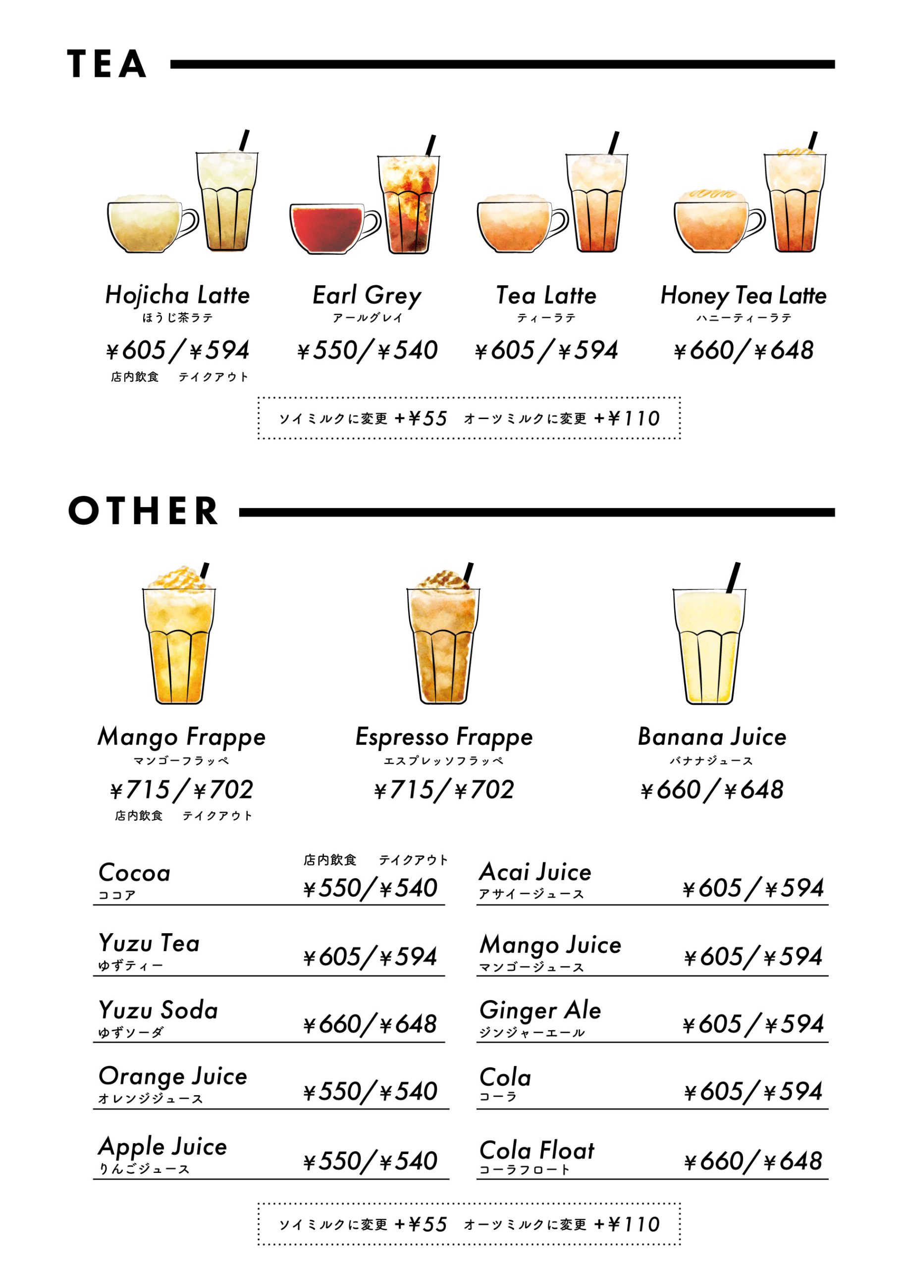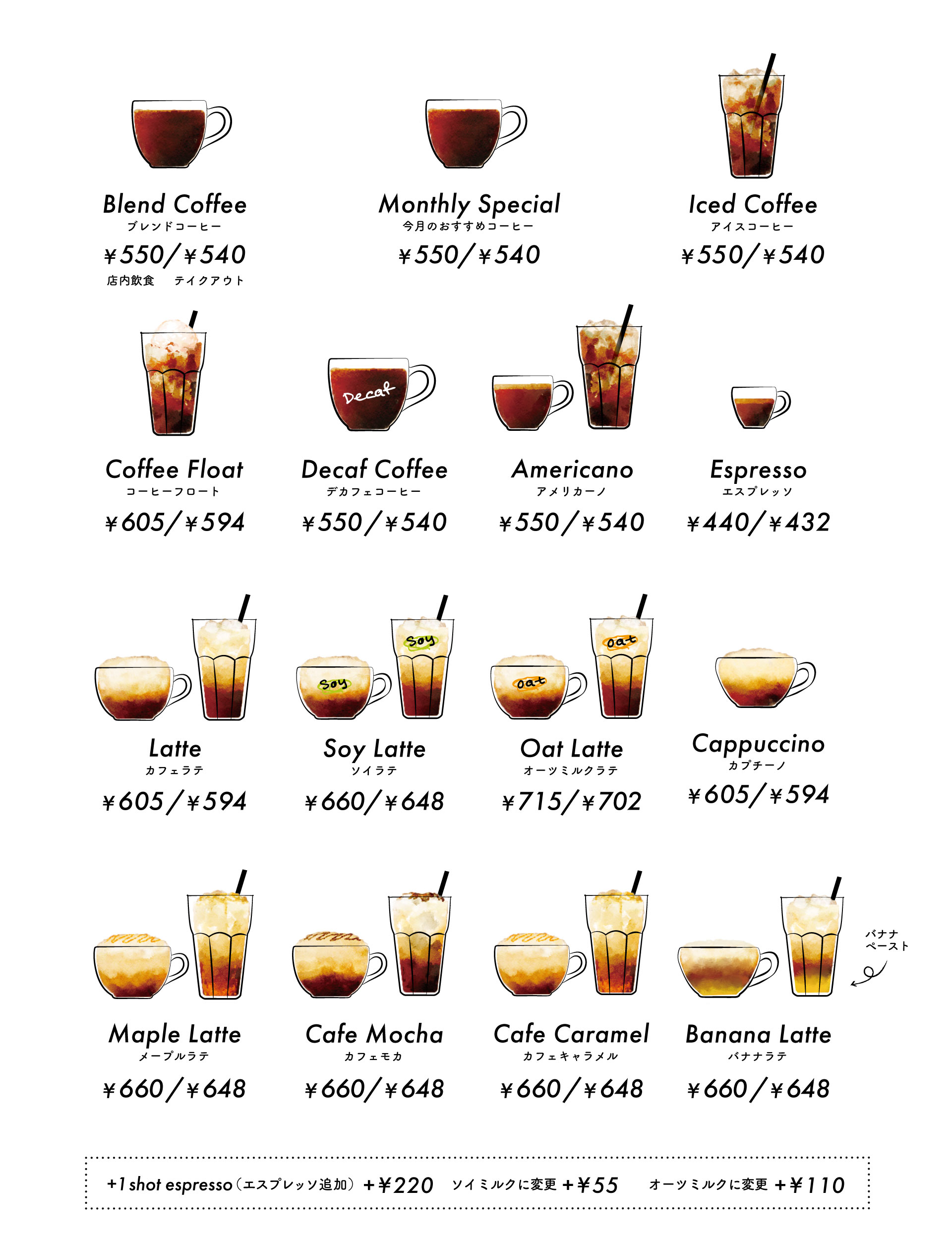B stand +では、フェアトレードコーヒーを中心に、紅茶や季節のドリンクをお楽しみいただけます。
